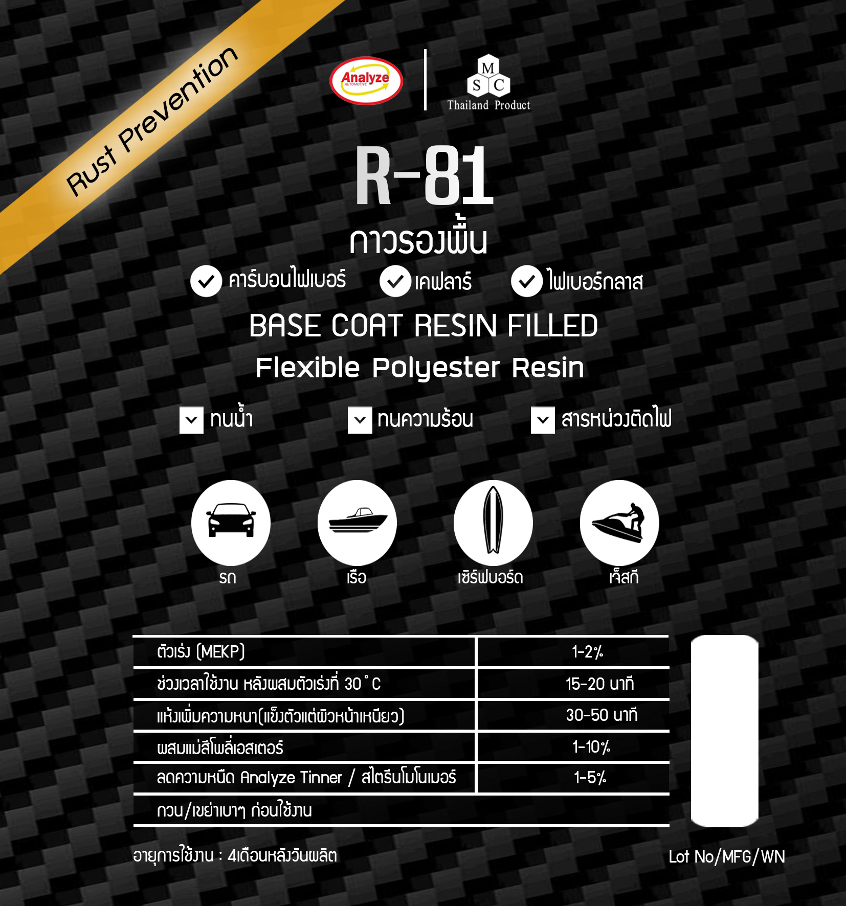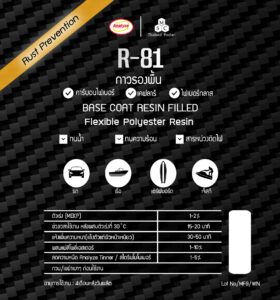 • ภาษาไทย: R-81 เป็นโพลีเอสเตอร์เรซิ่น ประเภท ISO ผสม อ่อนตัว ยึดเกาะดี ทนความร้อนได้สูง มีสารป้องกันสนิม